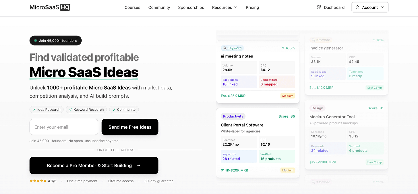 We took everything that made the newsletter valuable – the curated ideas, the market research, the founder community – and rebuilt it into the largest platform on the planet for Micro SaaS builders. One place to find your idea, learn how to build it, and grow it to $10K MRR.