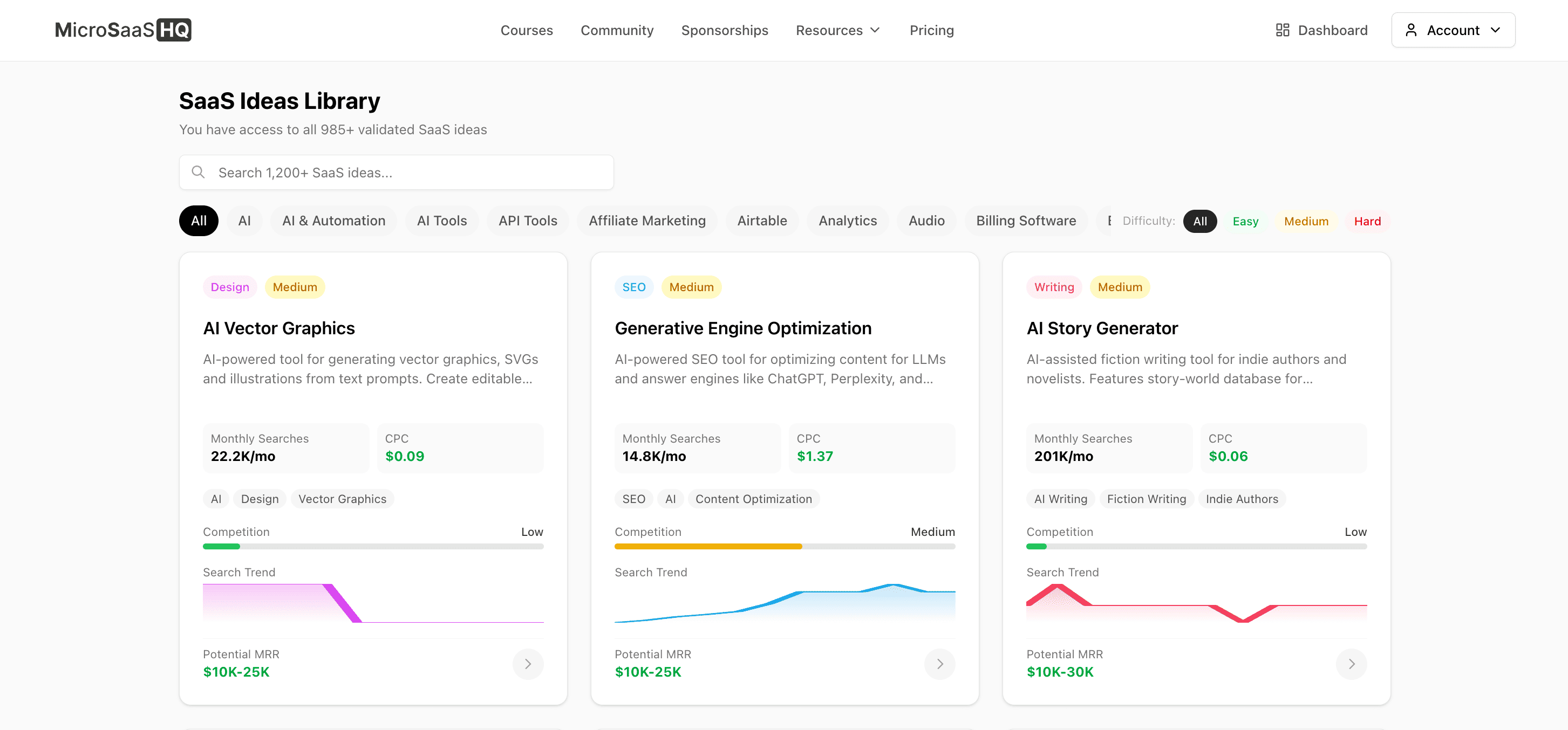 Searchable database. Filter by niche, difficulty, revenue potential, competition. Every idea includes market sizing, competitor analysis, pricing models, and AI build prompts ready to paste into Cursor, Lovable, or v0. Pick an idea at 9 AM, start building by 10.