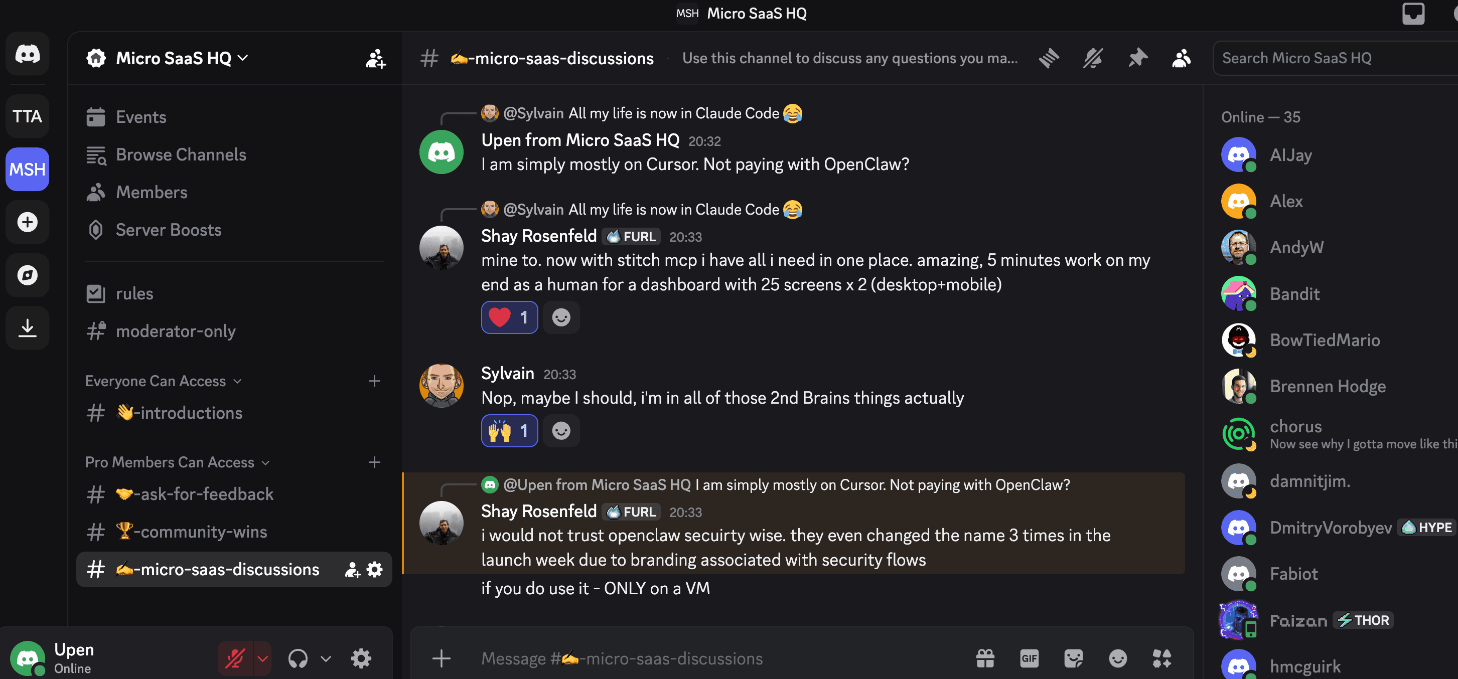 44% weekly engagement. Co-founder search. Launch day support. Product feedback. Accountability discussions. The most active Micro SaaS builder community online.